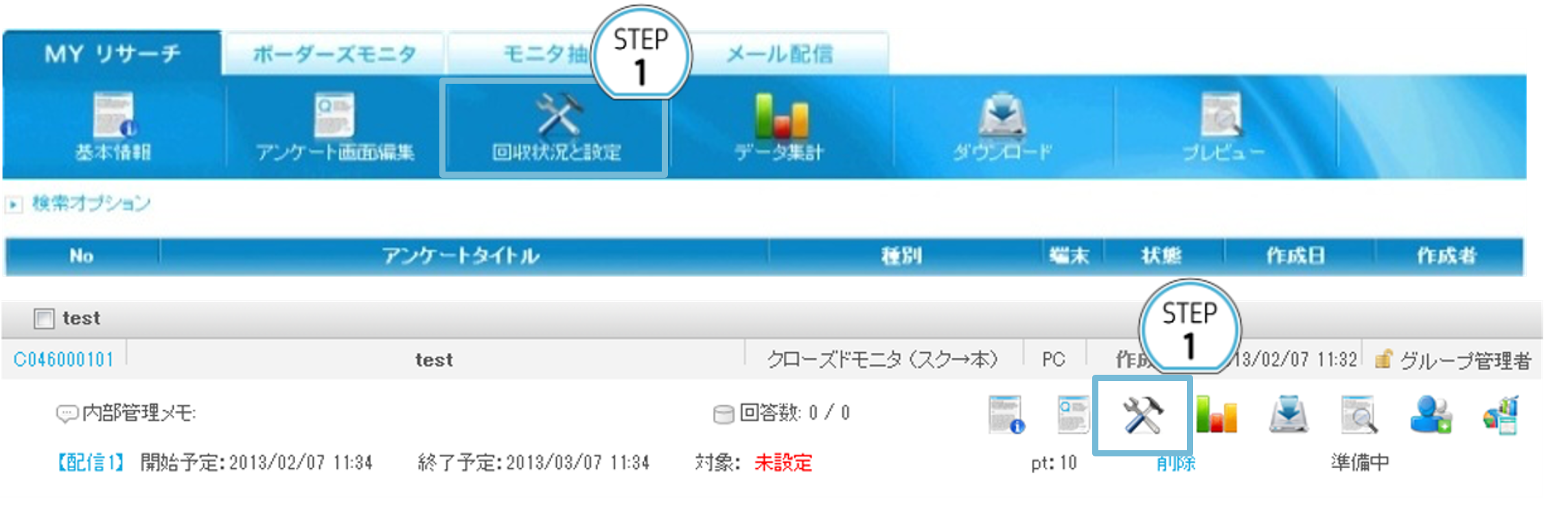 ①対象リサーチの「回収状況と設定」をクリック(図のいずれからもアクセス可能)