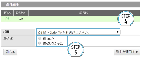 矛盾回答の予防や、回答者の負担軽減のために選択肢の表示、非表示の設定ができます。