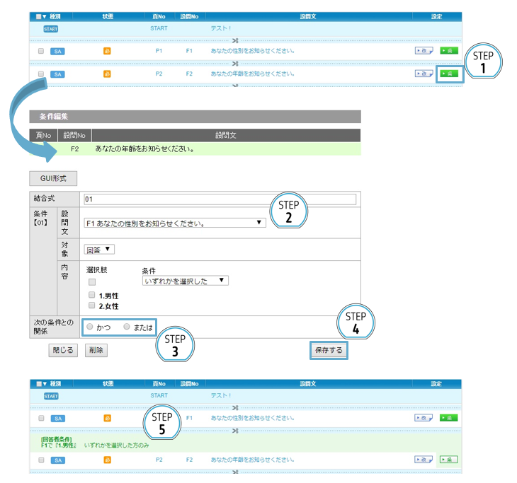 ⑤ アンケート編集画面に緑色で回答条件が表示される