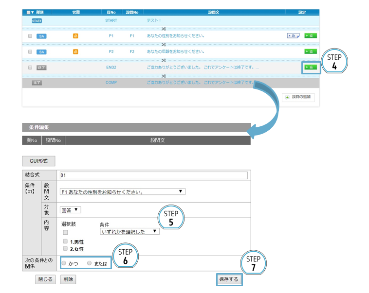 ⑧ アンケート編集画面に緑色で終了条件が表示される