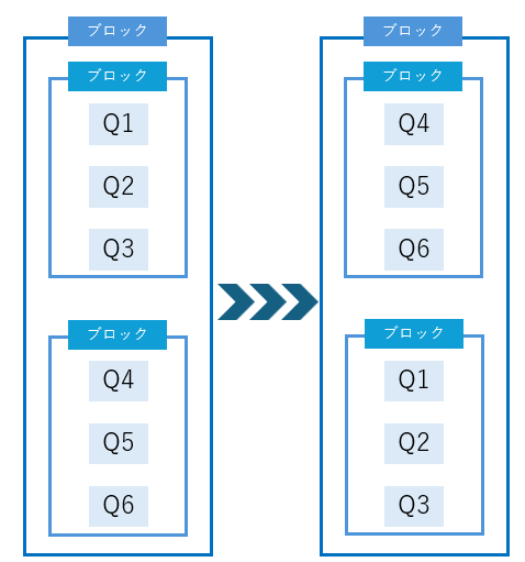 設問間ランダマイズとは、複数の設問を指定して1つのブロックを作成し、そのブロック内で設問をランダマイズする機能です。