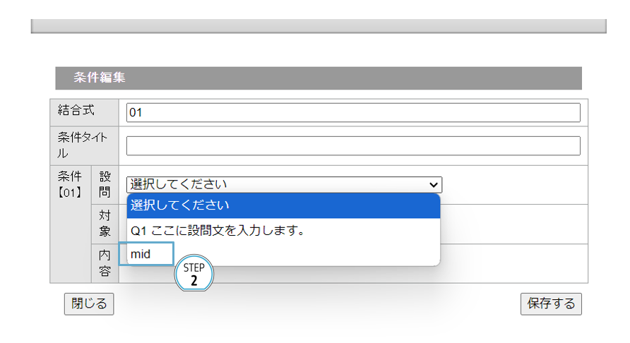 ②設問のプルダウンをクリックすると、①で設定したパラメータ名が出てくるのでクリックする