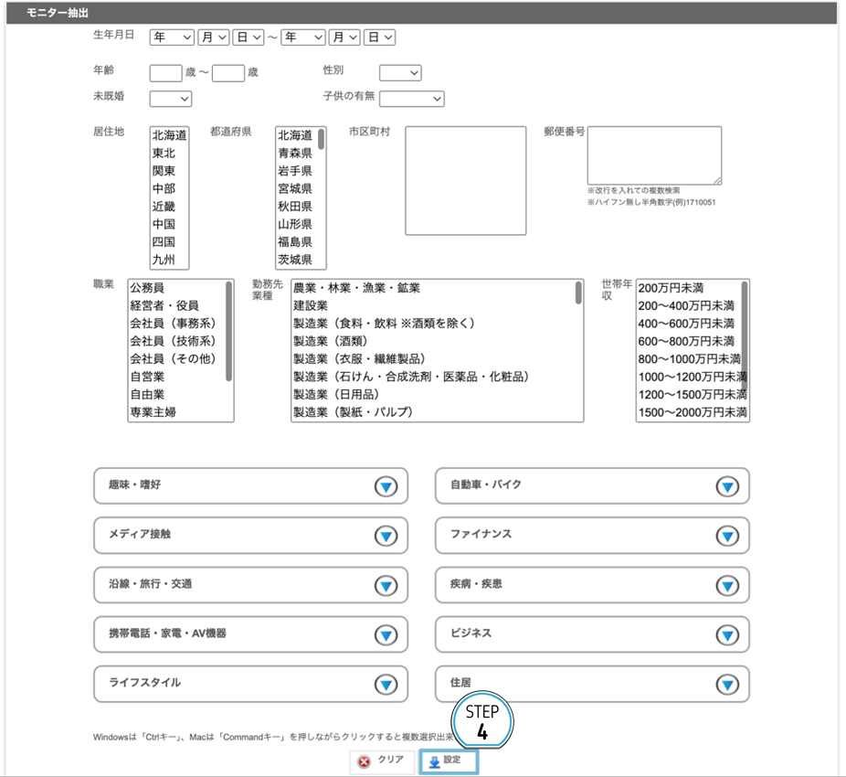 ④別ウィンドウでモニタ抽出画面が表示されるので、配信対象の条件を設定して「設定」をクリック
