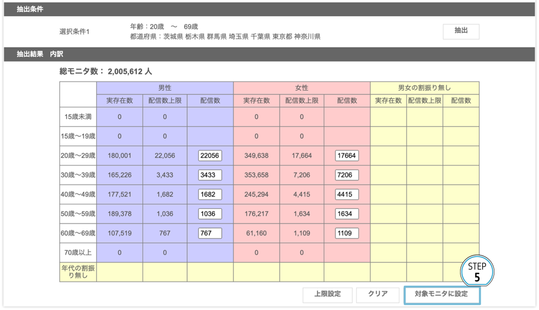 ⑤配信数を設定して、【対象モニタに設定】をクリック