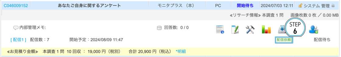 ⑥対象モニタが設定されると【配信依頼】が表示されるのでクリック