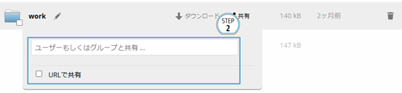 ① 共有したいファイルまたはフォルダにカーソルをあてて、「共有」をクリックする